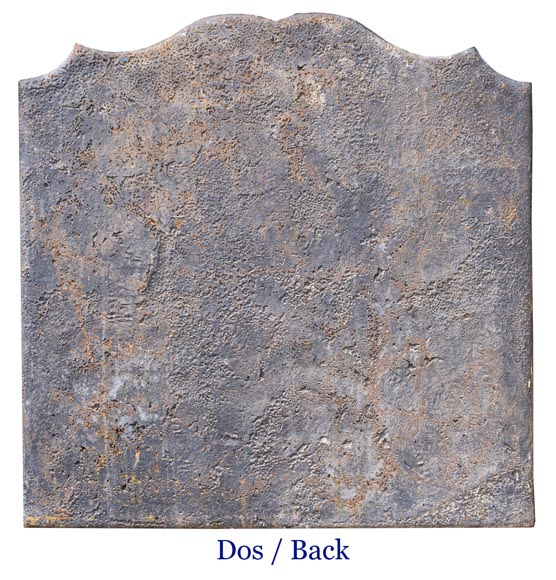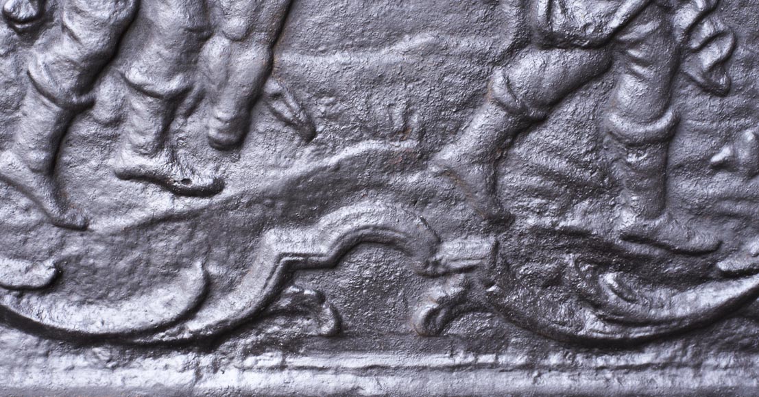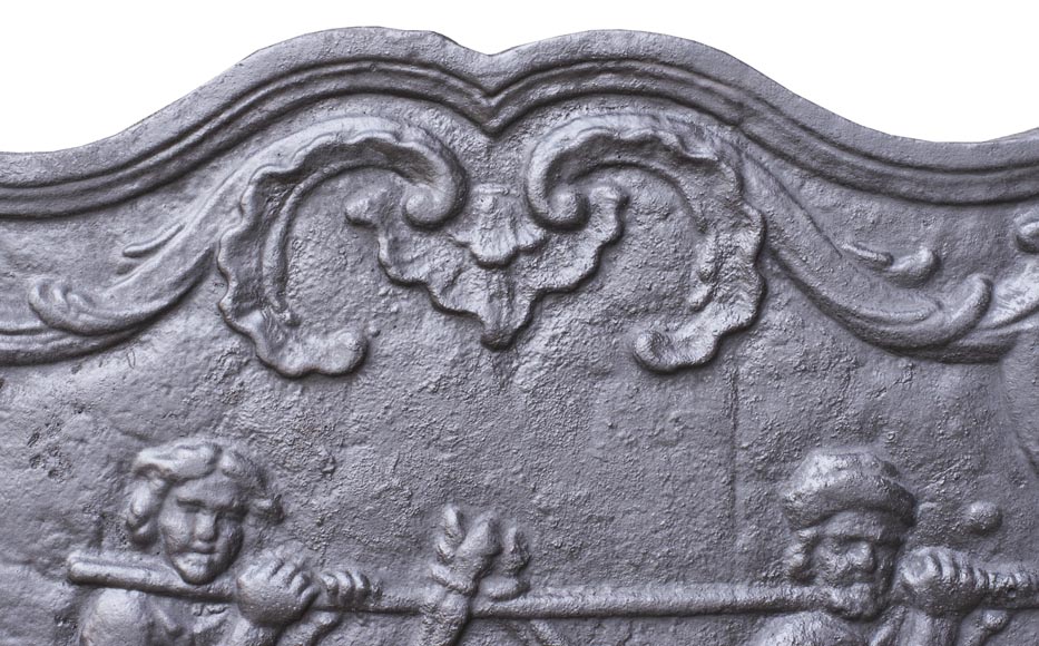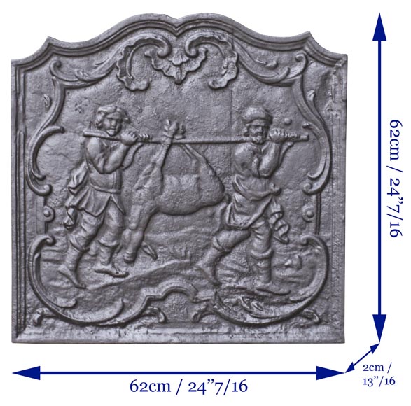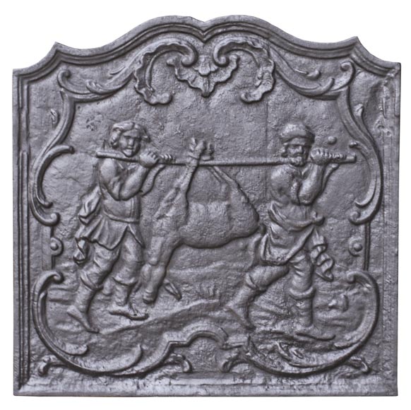 Made in the 20th century, this cast iron fireback depicts two hunters returning with their game, probably a deer.