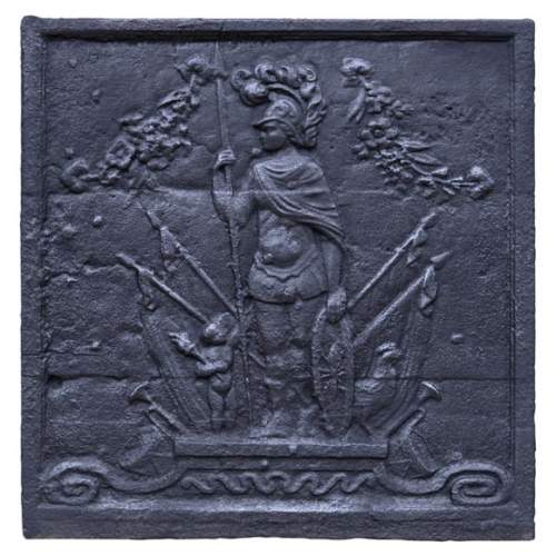 Cast iron fireback dated 1736 with an as yet unidentified coat of arms is a lush decor of foliage and scrolls. The sculpture is vigorous and delightful.
