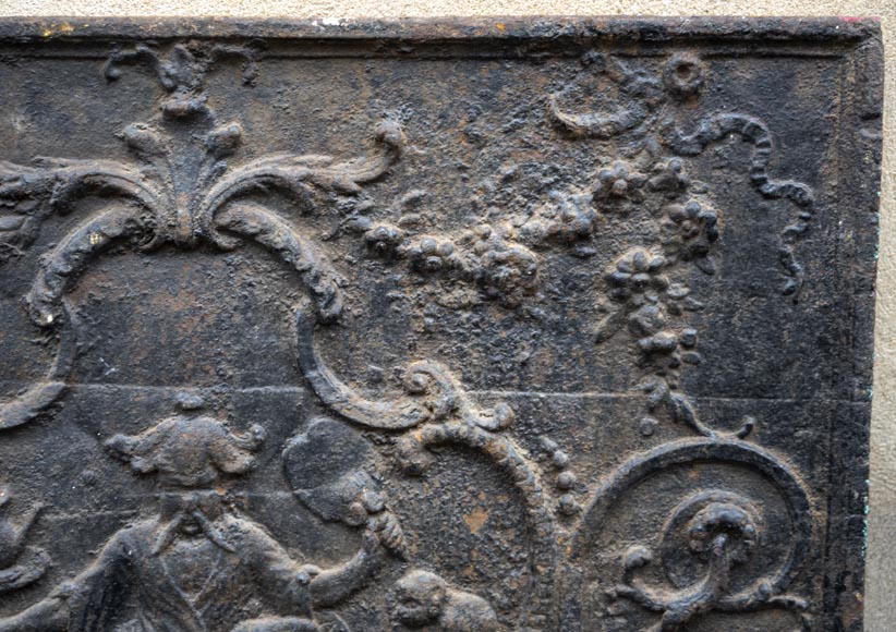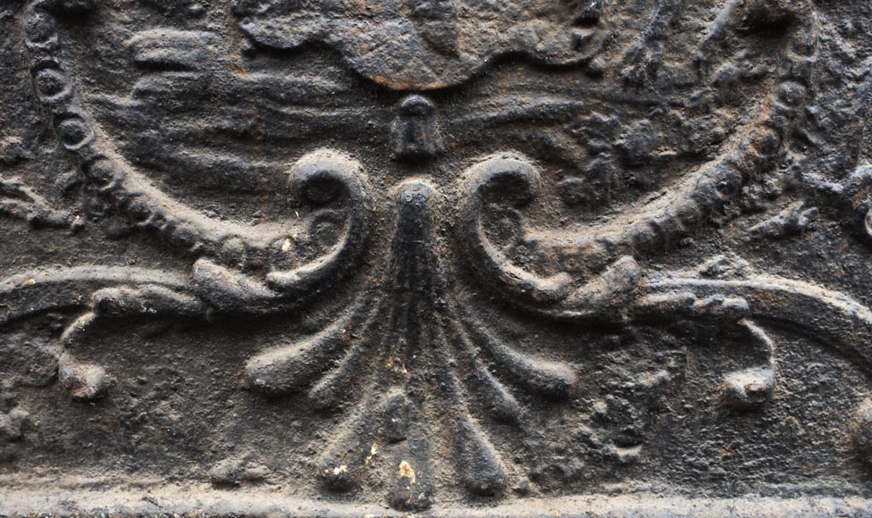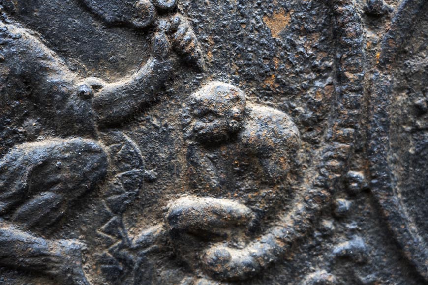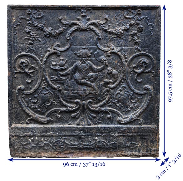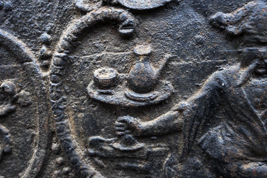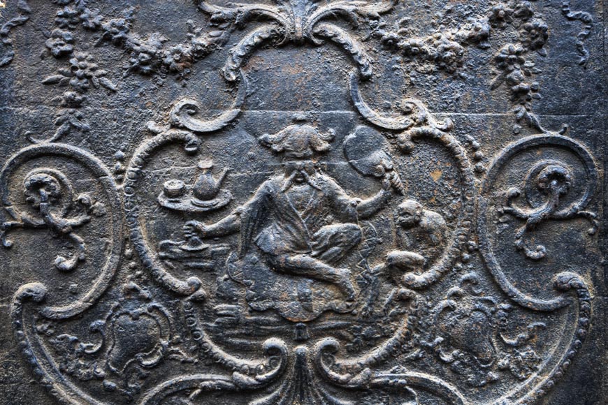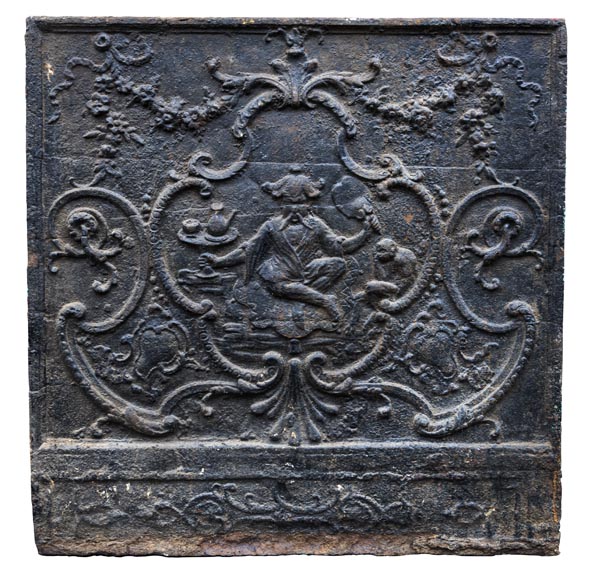 This fireback is a 19th century edition based on an 18th century model. A Chinese character serves tea with a small monkey. The decoration is inspired by a drawing by François Boucher (1703-1770).