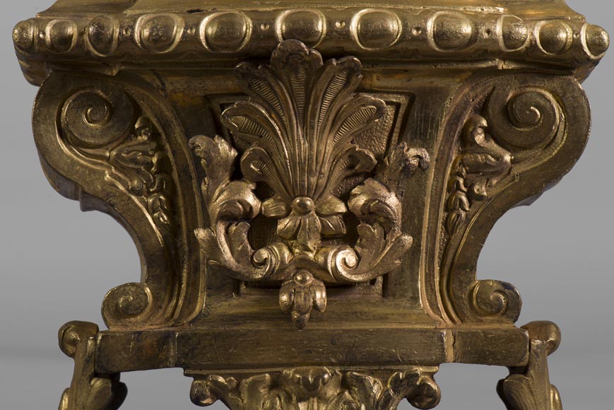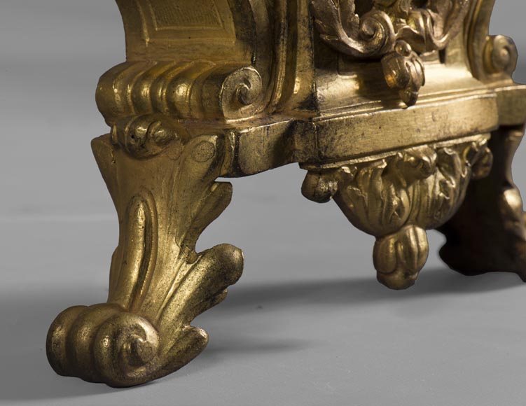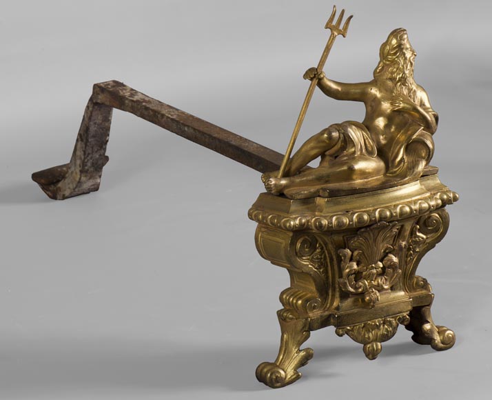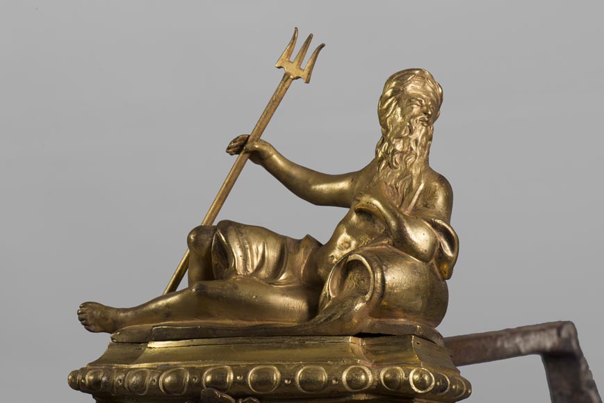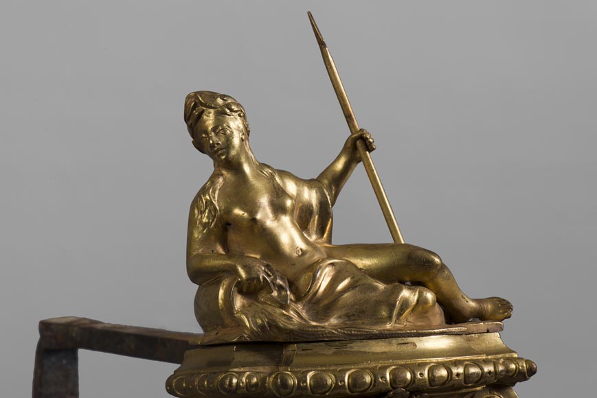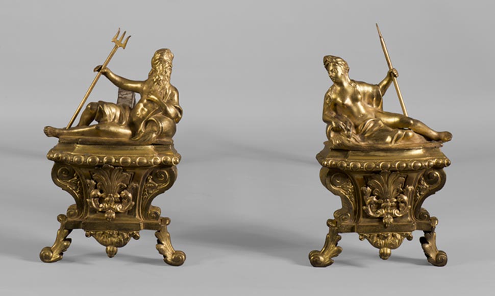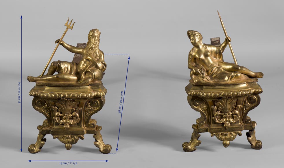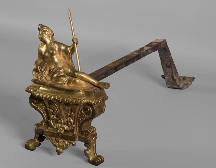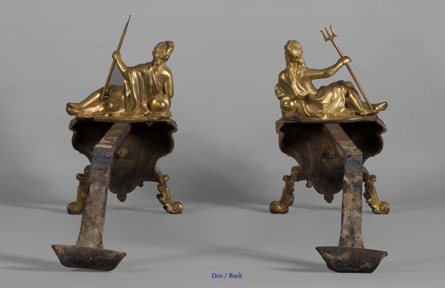 Charming pair of antique gilt bronze Louis XIV style andirons made during the 19th century. The decor features allegories of rivers.
