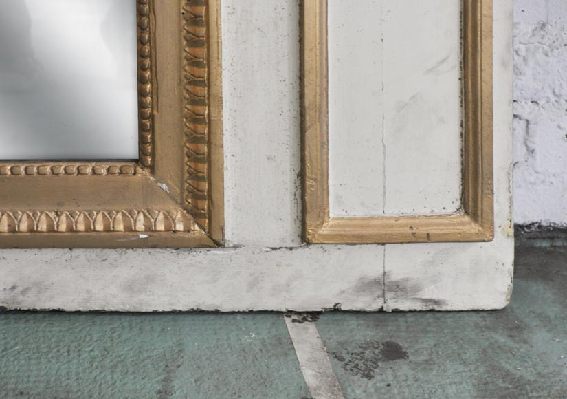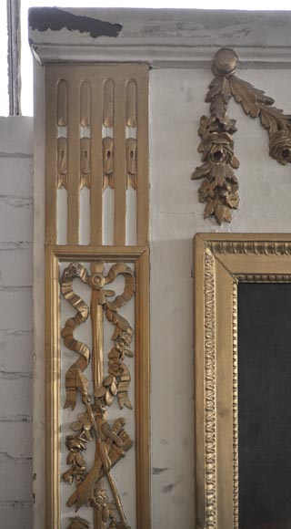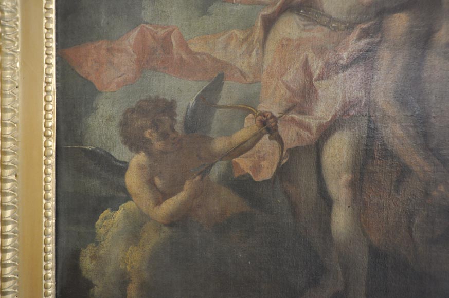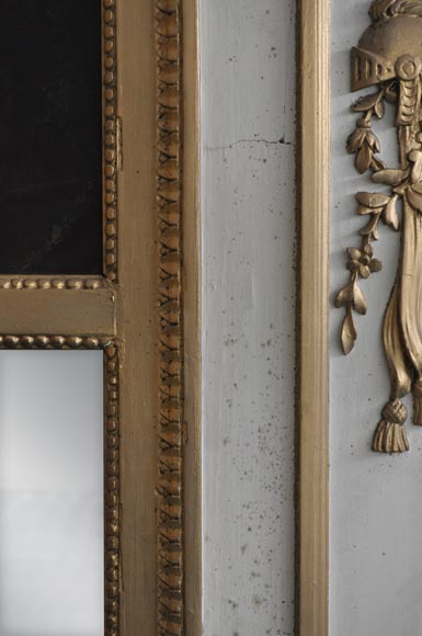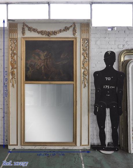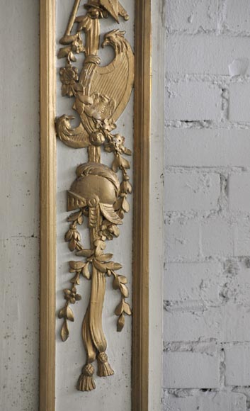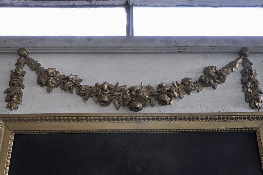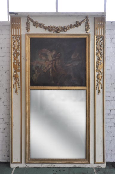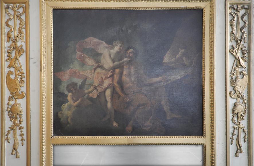 Rare Louis XVI style and period overmantel in carved wood, with a modern gilding. The upper part is decorated with a garland of flowers. Both sides are sculpted in form of pilasters, with roses, ribbons, quiver, sword, spear, helmet and griffin. A perl friez fram an oil on canvas figuring "Venus Asks Vulcan to Cast Arms for Her Son Aeneas" and an original mercury mirror.