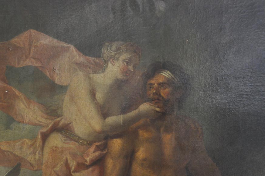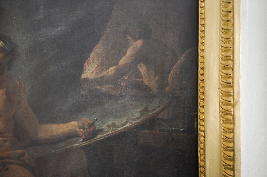 The devotion of Vulcan towards Venus is represented in this overmantel. We see the Goddess taking in her hands the face of her husband, overcome by her beauty. He holds in his hands a chisel and hammer, to complete the shield of Aeneas, placed on his knees.