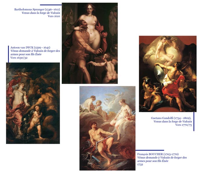 In Roman mythology, Vulcan (1) and Venus (2) form a very asymmetrical couple : the god of smithy, very ugly and the goddess of love, a true beauty. This strange union is due to Jupiter (3), god of gods and father of Vulcan, who wanted to please his son and gave him in matrimony, the most beautiful woman of Olympus. This gift was not only the fruit of his paternal love, as the god of thunder, he also needed him to continue to build his lightning. Unfortunately, Venus was unfaithful, especially with the god of war, Mars. Despite this, slave of his beauty, he will access all hers demands.