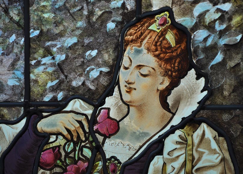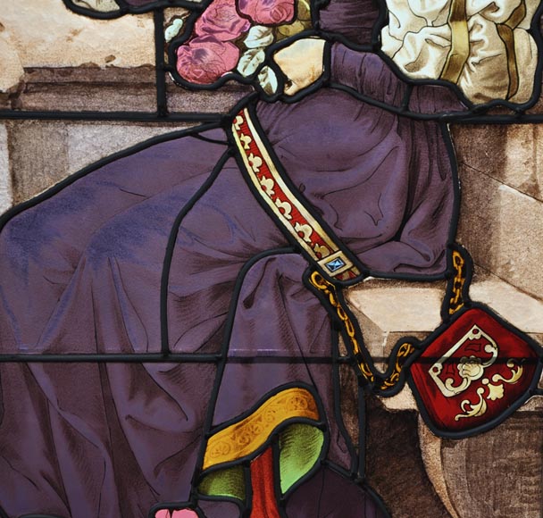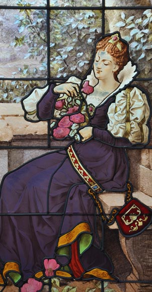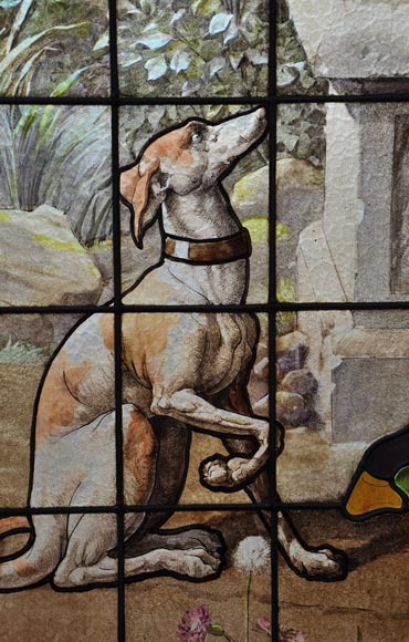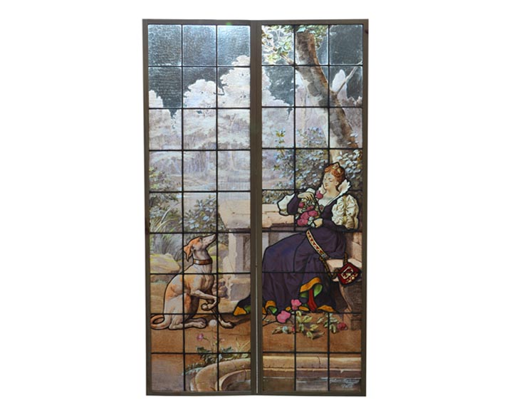 "The lady with the greyhound", stained glass window signed by Hubert Martineau Paris