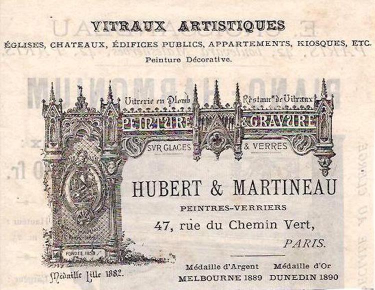 Hubert and Martineau were Parisian glass painters and stained glass manufacturer in the last quarter of the 19th century. They realized the superb decor of the Fermette Marbeuf, a restaurant located on the corner of Rue Boccador and Rue Marbeuf in Paris. They also realized in 1891 - 1893, the stained glass of the Saint-Rémi church of Draveil, Essonne.