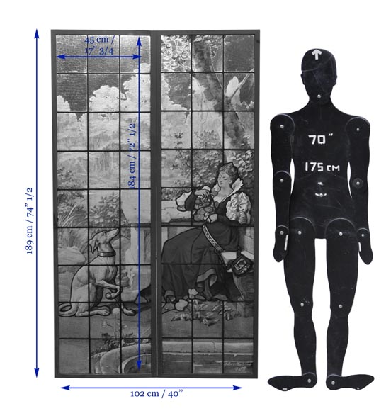 The double window features a woman dressed in the fashion of the 19th century, resting on a bench next to a greyhound and an ornamental pond.
