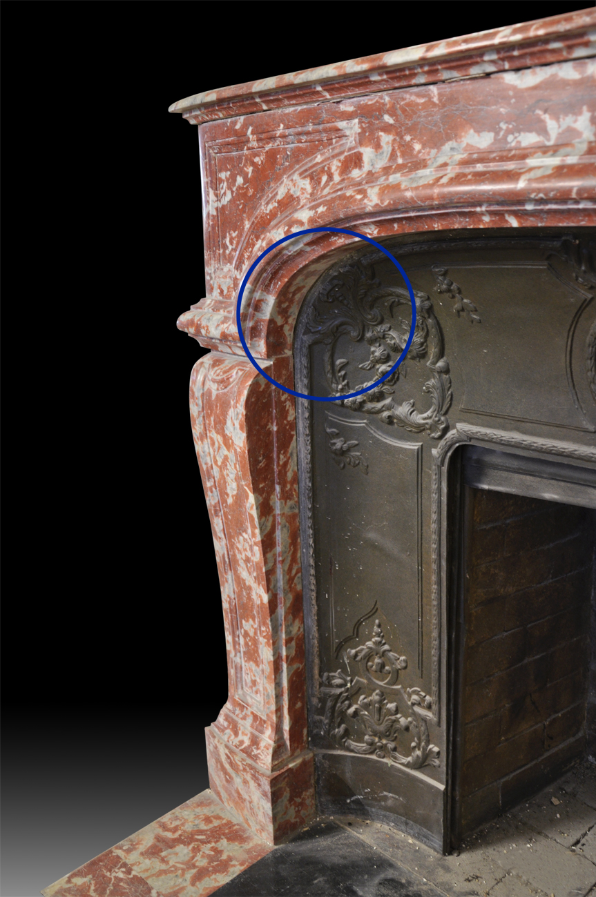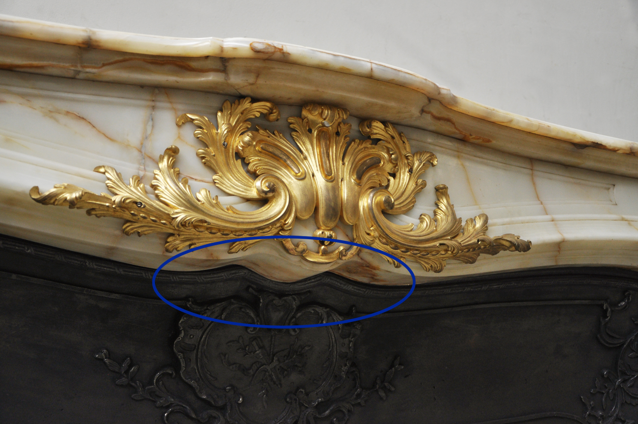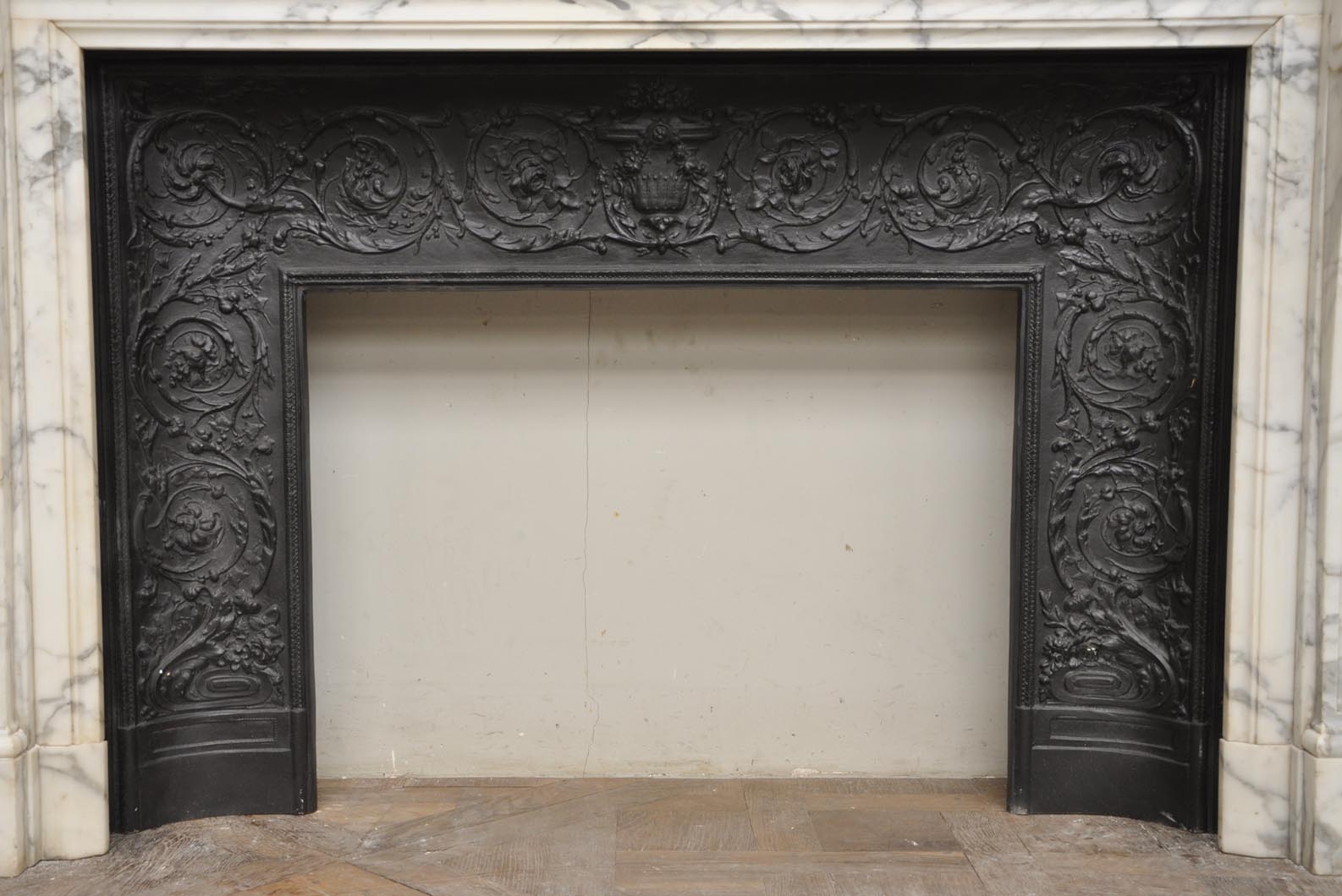 Very beautiful antique fireplaces are sometimes provided with their original cast iron insert. If so they are often decorated with elegant foliages, volutes and open flowers.