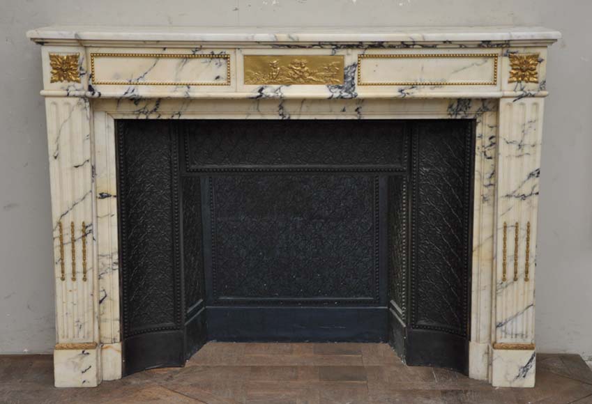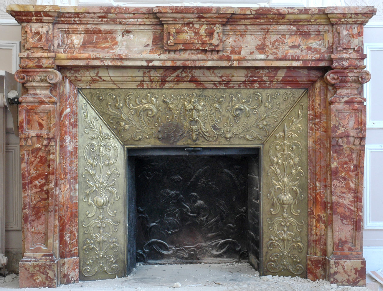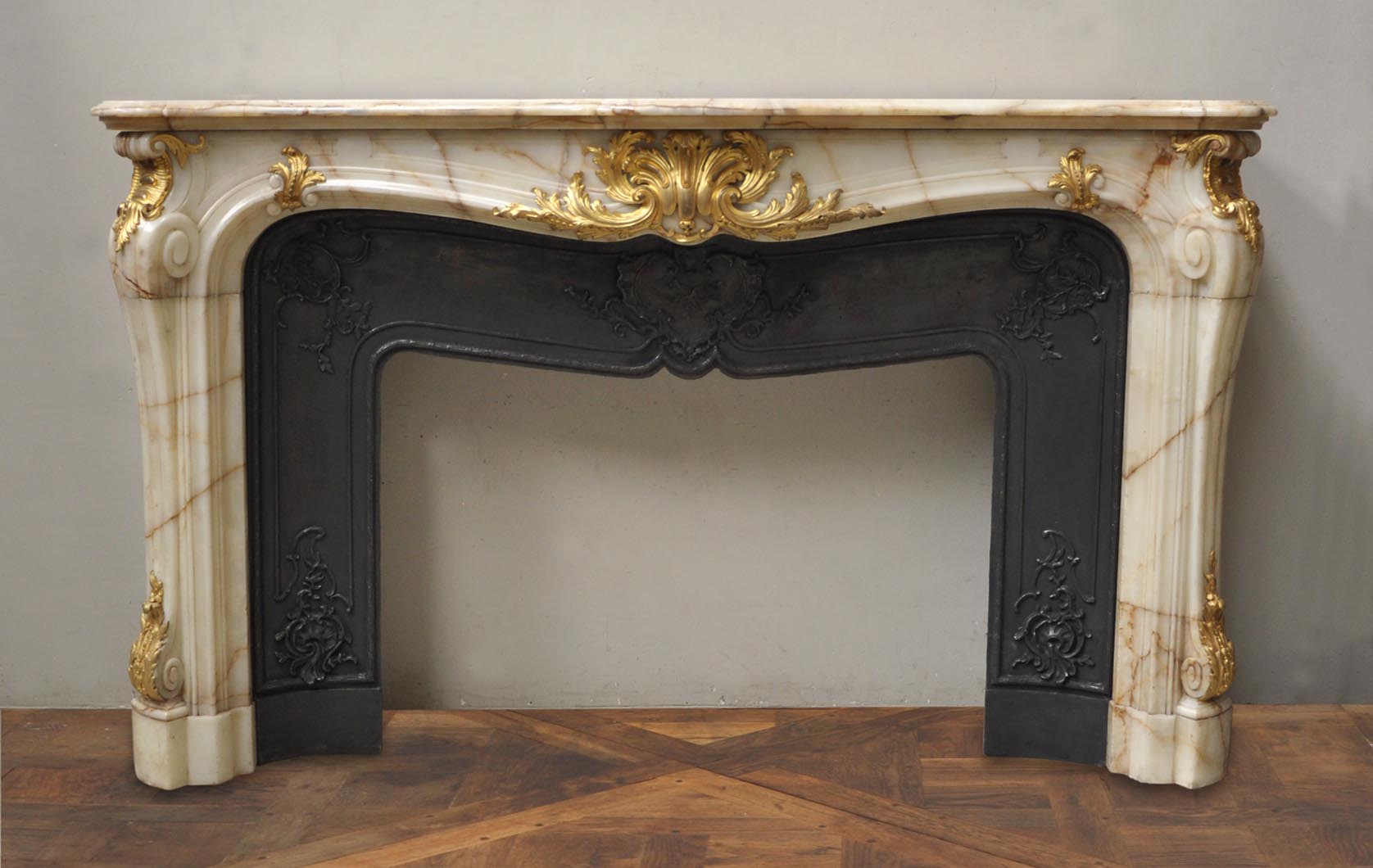 Very beautiful antique fireplaces are sometimes provided with their original cast iron insert. If so they are often decorated with elegant foliages, volutes and open flowers.