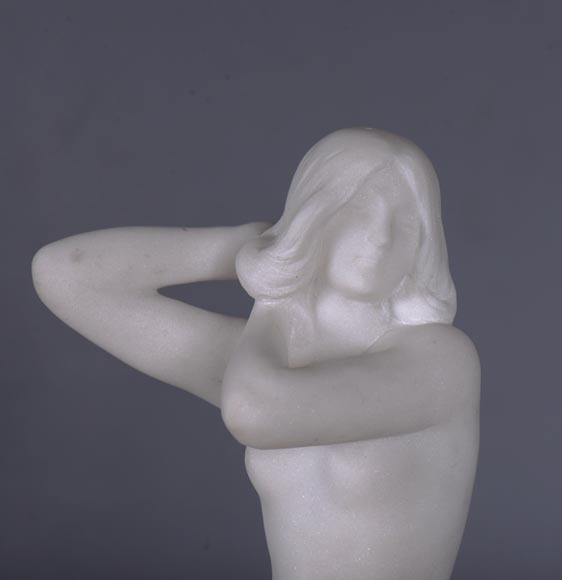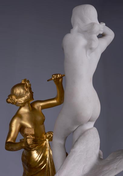 This young woman holds in each of her hands the sculptor attributes : the hammer and the chisel. She is here represented sculpting a marble statue of which the white color is contrasting with the gilt bronze. This sculpture of a naked woman seems to be the representation of the goddess Hebe accompanied with Jupiter's eagle next to her feet.