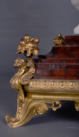 This very original sculpture made in the second half of the 19th century depicts a subject in marble and gilt bronze put on a Napoleon III style base in Red Griotte marble mounted in gilt bronze. This mount shows a decor of chimeras on the four scroll feet, lightened up with fruits baskets.